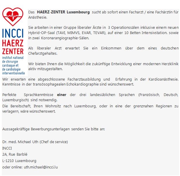 Das HAERZ-ZENTER Luxemburg sucht ab sofort einen Facharzt / eine Fachärztin für Anästhesie.